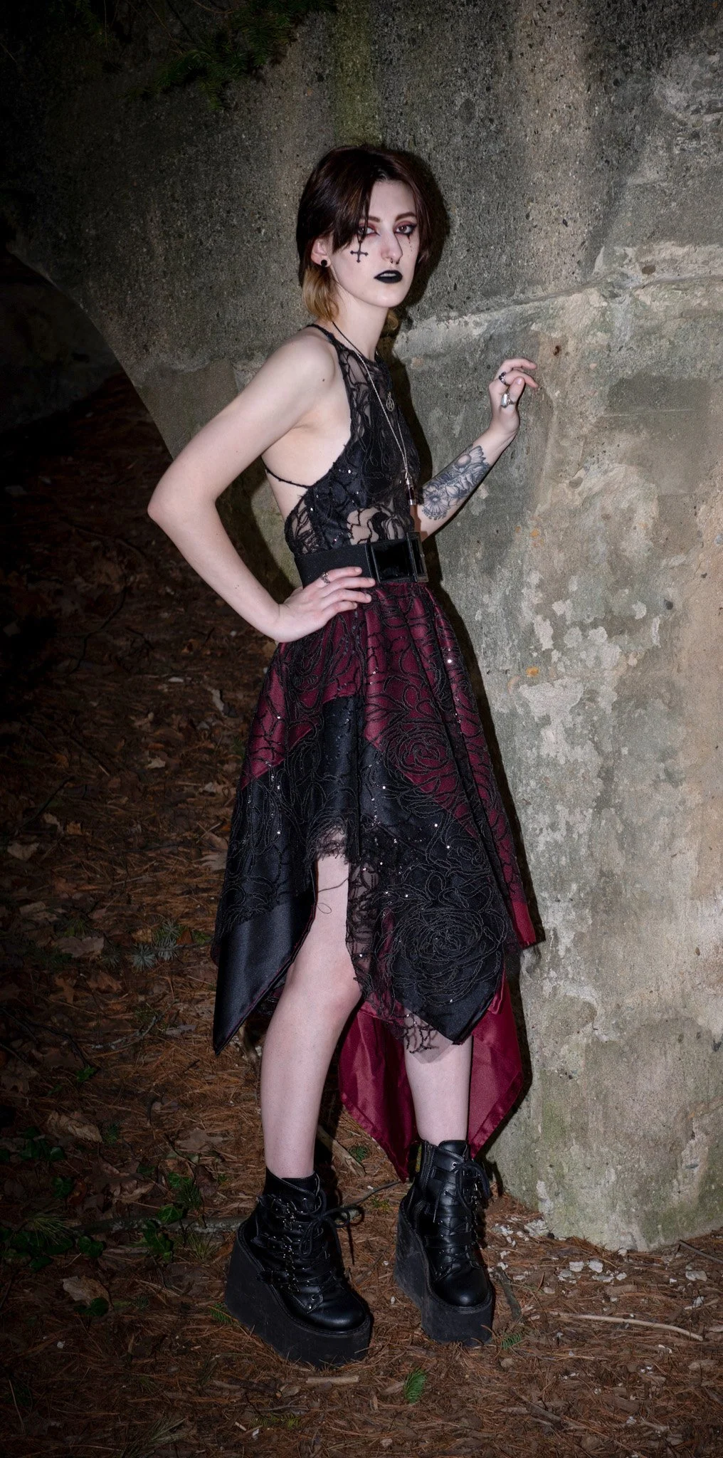Skirt is comprised of 3 asymmetrical layers, a Black Satin, Dark red Satin, and a top layer of the mesh from the bodice of the dress.